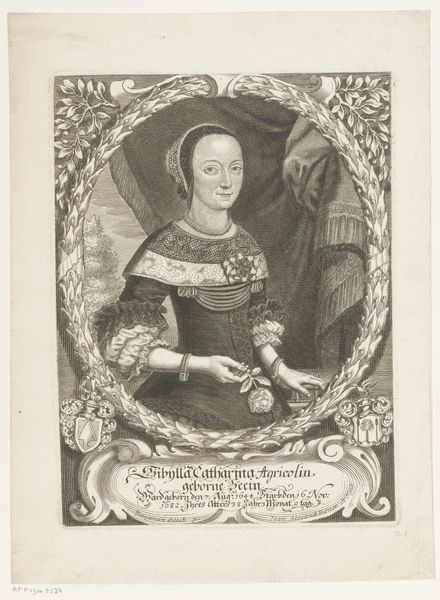 Curator: Here at the Rijksmuseum, we have an engraving titled "Portret van Margaretha Christina Wendler" dating back to between 1690 and 1693 by Elias Hainzelmann. Editor: The first thing I notice is the somewhat severe elegance. She's framed by this delicate laurel wreath, which feels almost paradoxical given her intense gaze. What does that frame symbolize in this context? Curator: It's fascinating, isn't it? Laurels, traditionally signs of victory and honor, could be a marker of social status for Margaretha, her family. As an engraving, think about the reproductive capabilities—this image could have been distributed widely, reinforcing the social structures. Consider the labor: the engraver’s skill in rendering minute details using relatively basic tools would have added to the subject's allure. Editor: Precisely. I see the layers. The pearl necklaces suggest purity and wealth. That elaborate brooch, perhaps with family heraldry at its center, it’s visually anchoring the entire composition. Those elements together tell a powerful story of heritage and power. Curator: Let's not forget the inscription below. Note how her age at death, 36, is prominently displayed. Engravings like this weren't merely decorative; they served as biographical records. Did this proliferation alter the perception of the family and individual’s legacy over time? Editor: Absolutely, they curated public memory, preserving the Wendler name and lineage through widely distributed images. These images are powerful objects of memory and status, speaking volumes about cultural ideals of beauty and position during the Baroque era. The contrast between the ephemerality of life, and the endurance granted by this medium… quite potent, isn't it? Curator: It gives a sense of the social currents of that time. From my perspective, these details highlight the tangible resources and complex craft that underpins such a seemingly simple image, pointing us to the broader conditions of its creation and dissemination. Editor: Indeed, analyzing the symbols helps reveal a window into their worldview, a cultural tapestry woven with aspirations, status, and remembrance. I found how they wanted to be remembered profoundly illuminating.