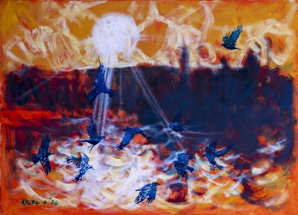 Małgorzata Serwatka made this painting, Level One, in an unknown year, using paint to capture a vision of runners beneath the sun. The colors are vibrant, and the way the figures are arranged and layered feels both carefully planned and intuitively rendered. Look closely, and you'll see how the texture and color create a sense of depth and movement, particularly with the band of dark purple rectangles, which suggest steps. The surface has a tactile quality, inviting the eye to wander over its details. The figures above are delineated in simple red outlines against a yellow sun, echoed by a band of figures below in dark blue, painted against a yellow ground. The piece has a raw, almost folk-art feel, with each element contributing to the overall emotional impact. The way Serwatka uses color and form reminds me a bit of Marsden Hartley, especially his interest in symbolic landscapes and figures. It's like they're both tapping into something primal and deeply human, through rhythm and simple expressive shapes.
