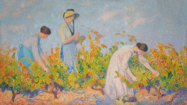 Editor: Here we have Paja Jovanovic’s "Vrsac Triptych," painted in 1895, a series of watercolor and oil paintings. It gives me a sense of rural life through linked scenes. What strikes you most about this piece? Curator: What jumps out at me is the explicit depiction of labor, segmented across the panels, each portraying a different stage of agricultural production: trade in the left panel, harvesting grapes in the center, and wheat gathering on the right. Jovanovic uses different materials—watercolors and oils—each playing a role in illustrating labor within these settings. Does the juxtaposition of these different materials make you consider the process behind creating the work itself? Editor: Yes, the blending of oil and watercolor techniques wasn't immediately apparent but influences how each part feels distinctly…processed, somehow. How does the form—being a Triptych—affect the viewer’s understanding of work in these agricultural systems? Curator: The triptych format suggests a narrative of production—emphasizing not only distinct stages of production, but creating a clear visual order out of otherwise perhaps equally important tasks. Note how plein-air painting embeds an understanding of natural resources and their use through agricultural labor; it represents a deep connection to land exploitation that fuels a specific market economy visible within the composition. What social class do you imagine makes up the population of this particular marketplace depicted? Editor: Based on clothing and labor shown, I'd guess mostly middle class interacting directly with the farming class that sustains them, the former owning or reselling the commodities processed. Considering this view through a materialist lens makes it very evident! Curator: Precisely! Viewing artistic creations this way invites questions regarding social hierarchies, production methods, and underlying structures supporting artistic creation. Understanding these facets of society truly completes our vision. Editor: I completely agree, I learned that there is a clear intent and production displayed through technique and the material world. It broadens my understanding of material culture.