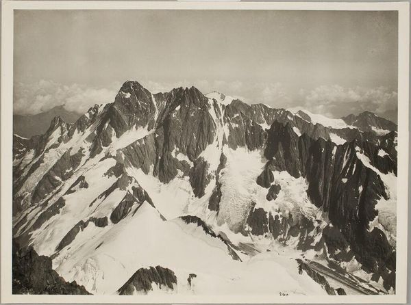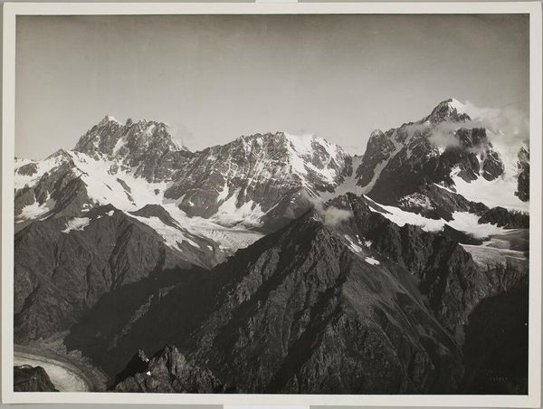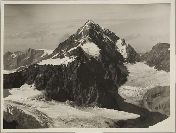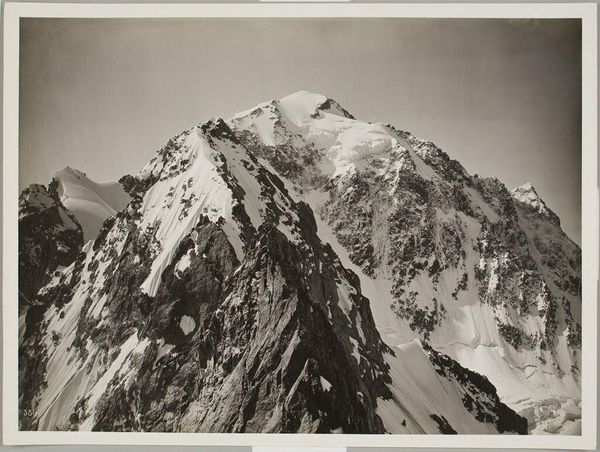 Curator: Vittorio Sella's stark photograph captures "Giulohi from the Sugan Glacier, Central Caucasus." It's a study in contrasts, really, all greys and whites. Editor: It certainly evokes a sense of isolation, doesn't it? The vastness of the landscape is almost overwhelming; you feel so small in comparison. Curator: Yes, and I think that's tied to the mountain as a long-standing symbol—of the sublime, of nature's power, of our own vulnerability in its face. The glacier, especially, holds a complex symbolism. Editor: The glacier reminds me of the very real and urgent threat of climate change. I mean, images like this are documents of a landscape that is rapidly transforming, disappearing even, before our eyes. Curator: Absolutely. Sella's work, though perhaps not intentionally, serves as a poignant reminder of what we stand to lose. Editor: It's definitely a powerful visual testament. Food for thought about our relationship with nature.