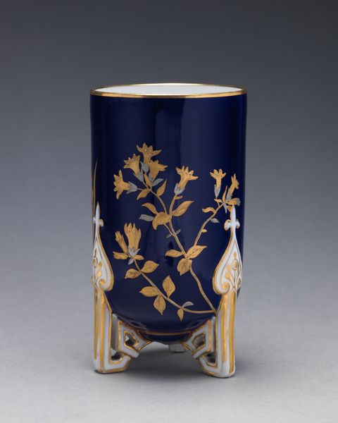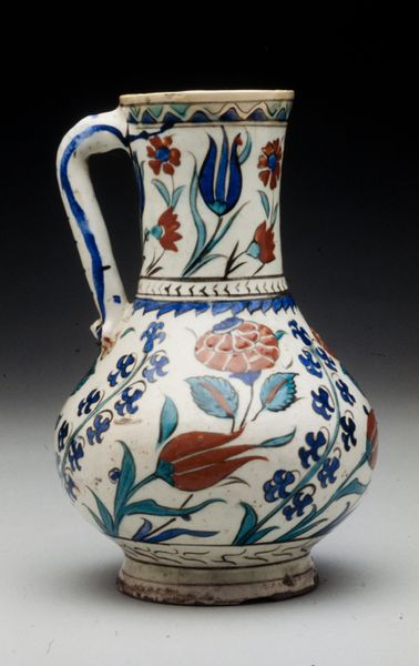 Editor: Here we have a ceramic tankard, dating back to the late 16th century, during the Ottoman dynasty. It's decorated with tulips, hyacinths, roses, and carnations. The vividness of the decoration stands out. What can you tell me about this object, considering its context and how it was crafted? Curator: Let's think about the means of production. The intricate floral designs are meticulously hand-painted, and point to a specialized workshop setting where artisans labored over these pieces. How does the materiality, the ceramic itself, influence your understanding? Editor: It’s fascinating to think about the labor involved. I guess the ceramic form allowed for mass production while maintaining artistic integrity through hand-painted decoration. It’s function and decoration so expertly balanced. Does the material reflect the social status of its owner? Curator: Precisely! Ceramic production wasn't just about churning out functional objects. It reflected status and wealth. Floral motifs in particular gained popularity; the types of flowers included and how accurately they are rendered speaks volumes. Would you consider the context of consumption in the analysis of such an object? Editor: Definitely! Seeing it as more than just a pretty tankard changes how I view it. Now I think of the owner displaying their status by drinking from such a beautiful object. Curator: Exactly. Considering process, material, and context gives you much deeper insights than focusing only on aesthetics, wouldn't you agree? Editor: I agree! I had never really thought about that, thanks so much!