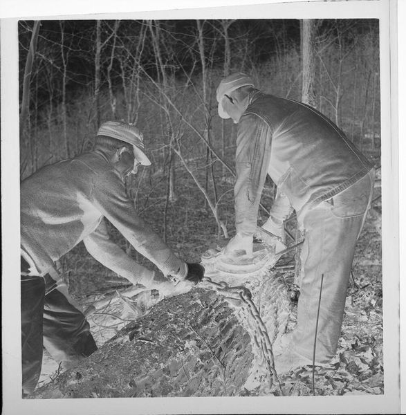 Curator: This small, undated photograph by Ken Whitmire Associates titled "Untitled (two men cooking in hunting cabin)" presents an intimate, though inverted, domestic scene. Editor: It's striking how the negative space creates a ghostly, almost dreamlike atmosphere. The high contrast really emphasizes the textures. Curator: Indeed, the stark contrast contributes to its semiotic power, drawing our eye to the arrangement of forms. The plaid shirts, for instance, offer complex patterns against the simple lines of the cabin. Editor: Look at how the composition highlights the process of preparing a meal. The modest tools and the interior of the cabin speak volumes about labor and self-sufficiency. Curator: Precisely, the materiality of the cabin itself, constructed from roughly hewn logs, provides a grounding structure to this otherwise ethereal representation. Editor: It feels like a snapshot of rural life, focusing on the everyday rituals and materials that shape a community's identity. Curator: Ultimately, the interplay between form and content offers us a glimpse into the quiet dignity of this commonplace scene. Editor: A beautiful reminder that art can be found in the simplest acts of survival and sustenance.