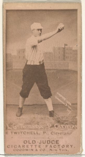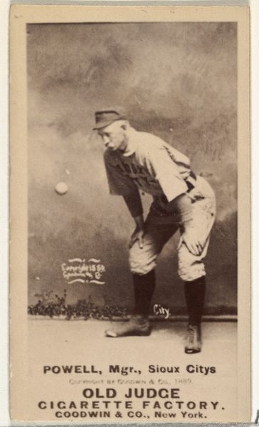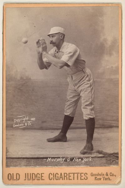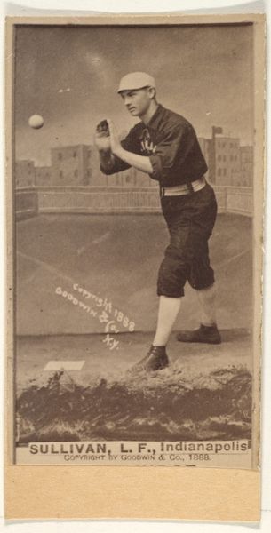 Editor: This is a gelatin-silver print from 1887 titled "Sullivan, Left Field, Chicago, from the series Old Judge Cigarettes," by Goodwin & Company. There's a sense of staged simplicity to it; Sullivan is posed but looks natural at the same time. What stories do you think it tells? Curator: I see a fascinating convergence of sport, commerce, and representation. Consider that this photograph exists as part of a cigarette card series. It was essentially a marketing tool embedded within a growing culture of consumerism and leisure. In that context, who is centered in this narrative, and what social functions are the promotion of sport and smoking meant to serve? Editor: Sport and smoking… almost sounds like conflicting ideas. Was this photo about the sport, or something else entirely? Curator: Precisely! We need to unpack what that means in 1887. Think about whose images were being circulated, whose labor was going unacknowledged, and what prevailing ideologies were being subtly reinforced through these everyday objects. This image can be used as an artifact in our understanding of gender roles and male identity. Editor: So, it’s less about the individual player and more about how he’s being used to represent broader ideas about American identity? Curator: Exactly. It allows us to consider power dynamics, class structures, and the very construction of fame. Editor: It is a great lens to understand so many things at once. I never expected a baseball card to be so deep! Curator: It’s all about perspective, seeing the connections between art, culture, and history. Every image, regardless of how trivial it may appear on the surface, is a portal into broader narratives.