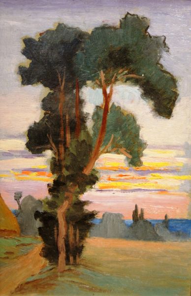 Editor: Here we have Albert Gottschalk’s "Aftenlandskab. Tisvilde" from 1905. The brushstrokes feel so loose and free, it really captures that fleeting moment just as the sun is setting. How do you interpret the composition? Curator: Intriguing question. Observe the diagonal arrangement. Note how the dirt road at left directs our eye towards the golden field at right. A centrally placed, full tree, however, disrupts a completely linear composition, introducing an element of asymmetrical balance, a focal point around which all else resolves. Editor: I see that now! It almost feels like the tree is anchoring the entire landscape. Does the choice of colour contribute to the feeling? Curator: Undoubtedly. The muted tones of the sky are in clear opposition with the luminescence of the golden field and lively green foliage. It directs us to evaluate formal relationship in colour between shadow and illumination, or earth and sky. Editor: So, without knowing the cultural context or history, we can understand the push and pull, almost the argument between different areas in this work, simply by observing the arrangement of shape and tone? Curator: Precisely. Though historical understanding would add layers of interpretation, Gottschalk’s success lies in the internal structural harmony he achieves through his composition. The interplay of form and colour communicate effectively regardless of context. What is your understanding of expression in nature conveyed through form? Editor: That's insightful! It shifts my understanding away from wanting to "know" what it means towards appreciating *how* it means. It seems to express harmony just as much as a scene itself. Curator: Yes. It is rewarding to look at art and assess that internal structural conversation that artists orchestrate within the composition.