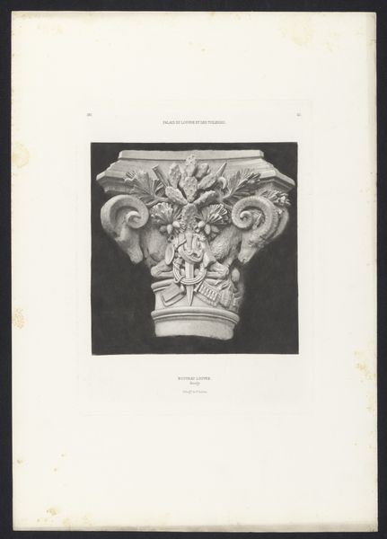 Editor: We're looking at a photographic print from before 1870, housed in the Rijksmuseum. It’s by Édouard Baldus and titled "Photoreproduction of a drawing, depicting the tympanum of a door (presumably) in the Palais des Tuileries in Paris." The detail is incredible, especially considering it's a photo of a drawing! It’s hard to tell what the overall effect was supposed to be like in situ. What stands out to you? Curator: Well, what strikes me is the act of reproduction itself. Baldus, known for his architectural photography, here photographs a drawing *of* architectural detail. This layered process reflects the 19th-century obsession with documentation and preservation, but also raises questions about authenticity and the hierarchy of art forms. Consider the socio-political context: the Second Empire was obsessed with grandeur, with its identity closely related to its aesthetics, but these things were constantly under threat from war. Reproductions such as these gained increasing prominence and value, especially as the architecture faced threats. How does Baldus's choice of media shift our understanding of the tympanum's intended impact? Editor: That's a great point – this photograph essentially becomes a historical document itself. The emphasis on geometric form makes the print resemble a blueprint or a technical plan. Curator: Precisely. Baldus’s photograph removes the object from its intended purpose and turns the architectural element into a symbolic form for mass consumption. We’re not just looking at a piece of a building anymore; we’re examining its representation within a broader system of power and visual culture. Editor: So, by documenting it in this way, Baldus both preserves the image and changes the nature of the original artwork itself? Curator: Yes, in a world that may forget the Palais, and one that may experience many more wars, the picture remains as its representative. I found this piece truly fascinating; I must think about reproductions some more. Editor: I'm definitely seeing how much a picture like this gains historical weight. Thank you.