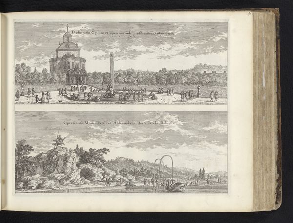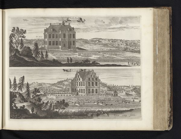 Curator: The print before us is titled, “View of the Greenhouses of the Stavsund Estate and the Main Building from the East,” created in 1694 by Erik Reitz. It showcases two different estate views. Editor: It’s struck me instantly with the contrasting interplay between architecture and nature. The rigid, symmetrical design of the buildings and gardens is striking. The way light falls across the facades is especially compelling. Curator: Yes, symmetry was quite the trend in Baroque estate design. What Reitz depicts is not just a building, but a manifestation of power. Stavsund's owner clearly intended to showcase control over the environment. The very act of precisely capturing it through the reproducible medium of print extended that statement of authority. Editor: Precisely! The print itself reinforces this sense of order. The horizontal divisions and balanced composition give a clear sense of structure, but there’s more than just mirroring. Note how the engraving lines modulate light and shadow, giving volume to form but flattening the perspectival illusion somewhat, thus further emphasizing planarity. Curator: Absolutely. Remember, prints like these also functioned as status symbols. They circulated among elites, reinforcing networks and celebrating shared values of the period: control, wealth, and refined taste. Reitz, by portraying Stavsund, elevated both the estate and its patron into this desirable conversation. Editor: It's intriguing how Reitz used lines to depict various textures and distances within a monochrome palette. There is real skill on display in the economy of mark making to generate the depth, shadows, and perspective. Curator: We can see that Reitz uses familiar artistic styles in landscape architectural drawing. The perspective he offers helps the audience not only understand the building layout but further consider their personal journey from the outside into these spaces of the privileged class. Editor: Looking closely has allowed me to realize how deliberately Reitz arranged the various structural details. Curator: Studying the broader distribution of prints such as these, what can be discerned from the image transcends being mere depiction to its serving as evidence of cultural communication through art.