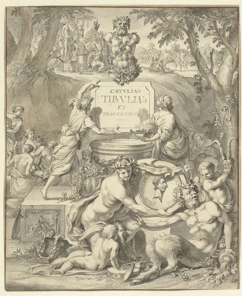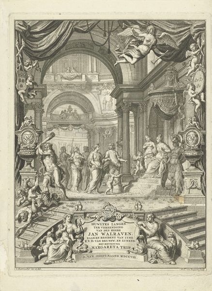 Curator: Abraham de Bruyn created this elaborate title page for a book of equestrian arms from across the globe back in 1577. It’s an engraving, part of the Rijksmuseum's collection. My initial sense? Controlled chaos. The frame is classical, almost stoic, but it's bursting with figures—centaurs, gods, horsemen. A very dense composition. Editor: Absolutely. The classical architecture provides a stable foundation, yet the mythical and martial figures create a dynamic tension. It feels representative of its time, a very humanistic moment where classical ideals were being used to process an expanding world. Those figures on horseback, literally astride different cultures, speak to that moment of encountering the 'Other'. Curator: Precisely! Consider the centaurs—beings caught between man and beast, symbolizing a sort of liminal space. They straddle the upper register of the title page, literally mediating between worlds. And the central text, the title, is framed by muscular, godlike figures representing perhaps strength or the taming of nature. It’s a careful ordering of perceived chaos. Editor: And the equestrian theme, recurring with the horsemen below flanking a small inset image. Equestrianism carried such weight – military prowess, aristocratic bearing, power and control. To present the customs from Europe, Asia, Africa and America in this framework isn't simply descriptive, it's implicitly making a statement about their standing relative to one another, under the guise of 'equitandi ratio'. Curator: You make an astute point about that "equitandi ratio," the manner of riding, subtly ranking cultures based on European sensibilities. Yet the inclusion of diverse figures, though viewed through a European lens, hints at the era’s burgeoning curiosity and expansion of awareness beyond its traditional borders. This is a period when the known world was rapidly expanding. Editor: A visual rhetoric typical for early modern attempts to catalogue, categorize, and control narratives around global encounters. The book itself would have been used to visually consume distant lands, reducing their rich diversity into digestible, and manageable imagery for the European gaze. Curator: It’s fascinating how much a single title page can reveal about a culture's self-perception and its attitude towards the wider world. It prompts us to see how symbols, even when seemingly straightforward, can conceal layers of complex meanings. Editor: Indeed. An exquisite artifact offering insights into the socio-political climate and aesthetic conventions during this crucial era of global engagement.