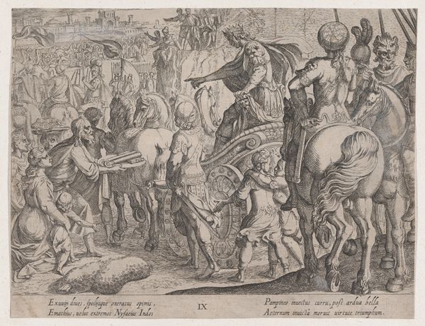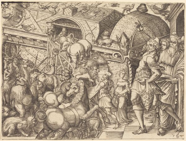 Curator: Marco Dente created this print, titled "Roman Horsemen Crossing a Bridge," sometime between 1515 and 1527, as part of the "Speculum Romanae Magnificentiae." Editor: It strikes me immediately as a composition dominated by linearity; the etched lines define every form, from the rippling muscles of the horses to the crenellations of the distant architecture. The density of these lines creates a strong contrast. Curator: Indeed. Dente’s approach emphasizes line to render a clear and reproducible image of Roman power and architectural achievements. "Speculum Romanae Magnificentiae," meaning "Mirror of Roman Magnificence," was precisely meant to disseminate images of Roman antiquities, shaping their perception across Europe. Editor: Note how the bridge seems almost to buckle under the weight of the central horse and rider. The implied stress—perhaps unintended—lends a tension to an otherwise straightforward scene. It almost suggests a coming collapse or impermanence to Rome’s magnificence. Curator: Your interpretation offers a valid perspective on the transience inherent in portraying "magnificence." However, within the context of the "Speculum," it is less about foreshadowing ruin and more about documenting extant structures and scenes. The column of Trajan, for example, served as a model and was not free from degradation during the Renaissance. These prints acted, in essence, as historical records. Editor: Perhaps. Though even the deliberate act of replication imposes a certain…interpretation, wouldn't you agree? The selective emphasis, the conscious artistry... This is not a photograph. The figures, especially their pronounced musculature, suggest an idealization – a visual argument as much as a historical document. The horses mirror this with an almost classical presentation of line and symmetry. Curator: An interesting point. Each artist involved inevitably brought their own style and artistic license. Yet, they collectively aimed to provide faithful representations. The work remains an invaluable visual record of a city undergoing both preservation and transformation. Editor: So we're left contemplating not just Roman magnificence, but its early modern interpretation and transmission through ink and paper. Curator: Precisely. A testament to enduring power captured in a fleeting art form.