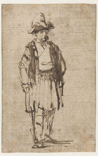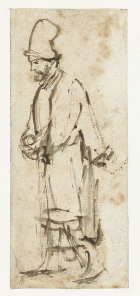 Editor: Here we have William Auerbach-Levy's etching from 1915, called "The New Talmud". I'm struck by the figure’s imposing presence, even with the muted tones. What historical context can you give me for this piece? Curator: Well, the date is key. 1915 was a time of great social and political upheaval, especially for Jewish communities in Europe, experiencing the rise of nationalism. Consider how the very title "The New Talmud" sets up an expectation. Does Auerbach-Levy reinforce or challenge stereotypical representations of Jewish scholars? Editor: I suppose it depends on your perspective. I can see how someone might find the somewhat disheveled appearance reinforcing stereotypes, but his direct gaze and the implied weight of the book he carries suggest a dignity that transcends caricature. Curator: Precisely! Think about the institutions surrounding art at the time. Jewish artists, though gaining recognition, often faced pressure to assimilate. How might this internal conflict manifest in their art? And, does Auerbach-Levy's work promote understanding or perpetuate potentially harmful imagery for public consumption? Editor: So, it's more than just a portrait of a scholar; it’s a statement about identity and representation in a changing world, made for an audience that may not be as familiar with his experience. He almost looks like he is scrutinizing us, the viewers. Curator: Exactly. The political weight of imagery can’t be ignored. Are we looking at an individual or an archetype shaped by the dominant culture’s gaze? Whose gaze matters here, and what impact does that have on the viewer? Editor: That gives me a lot to think about! It makes me want to research Auerbach-Levy's other works and how they were received. I didn't expect so much could be said from what I saw to be, at first glance, just a sketch. Curator: Seeing beyond the surface is what makes art history so rewarding. Now, imagine the discourse this piece might have started at the time!