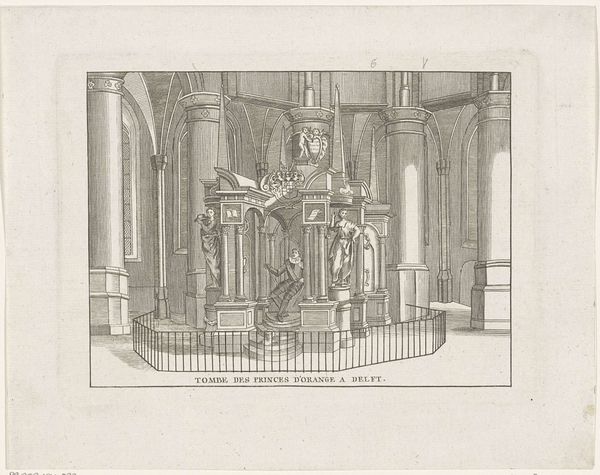 Johannes Cornelis Zürcher created this print of the Memorial for Hugo de Groot. This sepia toned print depicts an elaborate monument to the famous Dutch jurist and scholar Hugo de Groot. We see it set within what looks like a church interior, flanked by gothic arches and tall windows. De Groot, who lived from 1583 to 1645, was a towering intellectual figure in the Dutch Golden Age, writing on law, politics, and theology. The print reflects a 19th-century interest in commemorating national heroes and historical figures like De Groot. The monument itself, with its classical architectural elements, speaks to the cultural values of the time, emphasizing reason, order, and a connection to the past. To understand this print fully, we need to research the history of Dutch nationalism, the role of figures like De Groot in shaping Dutch identity, and the artistic conventions used to celebrate national heroes. It reminds us that art is deeply intertwined with its social and institutional context.