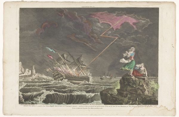 William P. Sherlock created this print depicting "The Perilous Situation of Major Money" using etching and engraving, a process that allows for fine, linear detail. The composition is dominated by diagonals—the angle of the deflating balloon contrasting with the man reaching upwards. Note how the lines of the balloon's ropes draw the eye to Major Money. Sherlock uses cool tones for the sea and sky, creating a sense of vastness and danger. The texture of the water is depicted with short, repetitive lines, giving it a sense of movement and turbulence. The print raises questions about the sublime and man's relationship to nature and technology. The balloon, a symbol of human ambition, is now a fallen object, humbled by the sea. The work challenges our understanding of progress and the potential for nature to destabilize human achievements.