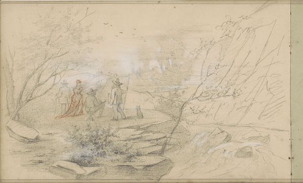 Curator: Looking at this page, I find myself transported to a scene of bustling activity, a slice of 19th-century life meticulously captured on toned paper. This sheet, entitled "Studieblad met arbeiders, wandelende en spelende figuren en een bosgezicht," translates to "Study Sheet with workers, walking and playing figures and a forest view" from Lambertus Lingeman, most likely produced between 1839 and 1894 using watercolor, coloured pencil, and pen-ink. Editor: It certainly does evoke a feeling of gentle industry and leisure combined. The composition, fragmented yet unified, carries the charm of a swiftly notated observation. The delicate lines feel more like suggestions, relying on tonal shifts for form. Curator: Indeed. Let us consider the individual figures. The rendering possesses an unassuming and innocent sentiment that invites deeper questioning on what these gatherings might signal. Do we see indicators of social unity or a nascent class divide in the contrast of labor and leisure? The central gathering of figures around what looks like an upturned bucket implies shared work, while the figures paired together further right appear engaged in higher social stratifications. Editor: Or maybe, the images indicate something less narrative and something more about the formal problem of figure placement itself. Note how Lingeman uses changes in scale and vantage point, a semiotic disruption of the page’s structure. The shift from near to far destabilizes conventional perspective. Do you think this evokes something more akin to a psychological landscape, perhaps? Curator: Intriguing, but the interplay between labor, leisure, and intimacy feels more to the period. This was a time of immense change, a societal balancing act—a waltz, even. How fascinating to view these subtle themes of industry and societal hierarchies reflected on the canvas through such subtle symbolic form! Editor: True. Still, for me, the appeal resides in how Lingeman handles light. He uses it to dematerialize forms while establishing a sense of spatial depth without relying too much on illusionistic artifice. The overall effect gives the sketch an elusive almost ephemeral character. It’s a very modern feeling that perhaps undermines any cohesive periodization. Curator: Perhaps in that very tension is where the piece finds its compelling nuance—both modern and historically referential. Editor: Indeed, a fascinating lens through which we may consider our shared past and evolving sense of artistic expression.