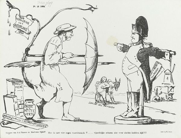Curator: Let’s explore "Politiek volgt het pijpen van het Kapitaal," a pen and ink drawing created sometime between 1900 and 1935 by Patricq Kroon. Editor: My initial impression is biting satire. The line work is sharp, creating a stark and somewhat grotesque caricature. The imagery evokes unsettling societal imbalance. Curator: Exactly. Kroon's piece is a clear visual statement about the relationship between political power and capital. We must look at the socio-political climate of the early 20th century to understand it properly. Think of the rise of industrial capitalism and its pervasive influence. Editor: It’s there in the craftsmanship, isn’t it? The use of drawing emphasizes accessibility—think political cartoons in newspapers, immediate and reproducible. Look at the artist using fairly simple materials. Curator: Precisely. The portly figure at the front, adorned with "Kapitaal," smokes a pipe, dictating terms. Notice how the figures behind, labeled "Politiek," "Economie," seem subservient, almost puppets. This reveals critical perspectives of power dynamics. Editor: It highlights a hierarchy reinforced through material production and visual representation. I would want to explore if it speaks to particular labour practices. I see themes about how certain industries may enable corruption in the name of money and industrial production. Curator: Absolutely. And considering that "Kapitaal" wears a hat that reads “reactie”, we must explore conservative backlash. There is historical commentary present regarding those who use money to reverse policies to stay in power. Editor: Kroon cleverly utilized accessible media to broadcast and consolidate political views to wider audiences at that time. The means by which it’s conveyed is as telling as its explicit critique. Curator: Looking through today’s lenses, it still holds incredible power in how it communicates social criticism by bringing intersectional factors such as economic status, social status, and access to power into dialogue with contemporary ideas and questions. Editor: The cartoon may have successfully captured these dynamics of labour and influence on policy. What a revealing piece when analyzed within its historical framework!