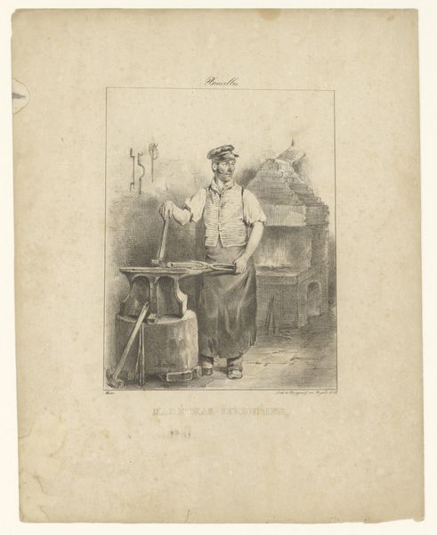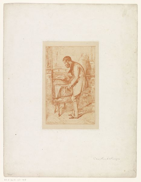 Editor: A thoughtful, almost melancholic piece. There's a stillness to it. Is that a man contemplating a grand volume? Curator: Indeed. This engraving, created sometime between 1826 and 1889, presents a genre painting known as "Book seller with an open book". Though the artist remains anonymous, the scene pulls us right into a moment frozen in time. We observe a man, presumably the bookseller, completely absorbed by the book he holds. Editor: The composition is simple, yet captivating. The way the books are stacked casually beside him, bathed in what seems like window light. I almost feel like I'm intruding on his private moment. It makes you wonder what story has him so enraptured. Curator: Right? I see it as a reflection on the act of reading itself – a celebration of the knowledge and escape found within books. The detail achieved with the pen and pencil – look at the intricate lines of the brickwork – brings a texture to the entire image. Editor: It's the perfect embodiment of that solitary pursuit, really. No fanfare, just a person and a book. Makes you think about how the socio-economic changes with the proliferation of printed books, that changed Europe since, oh, the late 15th century onward have really transformed daily life for more than just scholars, clerics, and noblewomen. A lot more people could suddenly read and interpret things by themselves. Curator: That is a really profound change, and seeing someone so focused makes me want to grab whatever I'm reading right now! It's as if the artwork invites you into its calm space, offering that moment of simple happiness to reflect on. I would happily buy a book from him if I could! Editor: Absolutely, it invites us to pause and appreciate the simple, profound power of reading. Well, if this visit encourages people to see reading in that light, then that's its own kind of victory!