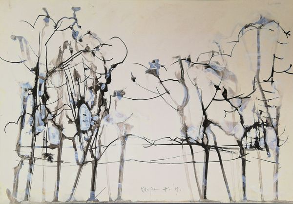 Alfred Freddy Krupa made this watercolor painting, En plein air at -6c, probably outside, in the cold, brrr! And you can tell he didn’t mess around. The paint is really flowing on the page. It’s mostly black ink, but there are touches of blue and gray – like he was trying to catch the light on the snow. I love the way the ink bleeds out at the top, making this hazy, atmospheric effect. Look at those dark trees in the foreground! They feel so graphic and immediate, but also like the memory of a tree, not a real tree, right? The lines are so expressive, like a quick sketch. It reminds me of Brice Marden’s drawings, where the line is everything, but it’s also nothing like Marden, because this is a place, a landscape. This piece shows how much you can do with so little. It’s all about capturing a feeling, a moment, not necessarily a place.