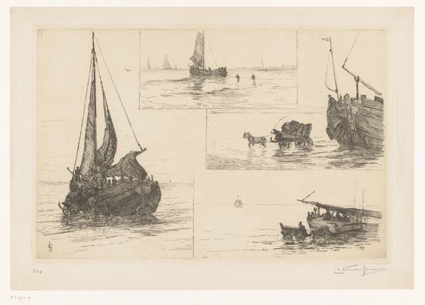 Editor: This is "Kade met wandelaars in Venetië" by Carel Nicolaas Storm van 's-Gravesande, dating from 1851 to 1924. It's an etching and print. The overall feeling is subdued, almost dreamlike. The composition, with the figures in the foreground and the Venetian architecture fading into the distance, really draws me in. How do you read the formal elements in this etching? Art Historian: Indeed. Initially, observe the limited tonal range; the monochrome palette constrains the work's potential dynamism. Yet, the artist uses delicate variations within this limited register to create a subtle sense of depth and atmospheric perspective. Notice how the etched lines define form, building up areas of shadow to imply volume and spatial recession. Does the subtle detailing affect the overall composition in your view? Editor: Absolutely. The fine lines, especially in the water, give a shimmering quality, and in some way grounds the city as ethereal and fleeting, it all comes together into an idea. It doesn't seem as realistic as some landscapes I've seen. I mean it shows some architecture, some figures but is not detailed oriented... Art Historian: Precisely. While ostensibly a cityscape, the composition eschews photographic accuracy in favor of evoking a mood. The focus is not on meticulous documentation but on suggesting an experience of Venice through suggestion and careful manipulation of light and shadow. We could say the form embodies romantic idealism, presenting the city as more feeling than fact. Editor: So the romantic idealism really does permeate through formal structure...Thank you for your perspectives; this etching holds so much more than I initially perceived! Art Historian: It was my pleasure. Keep examining how artistic choices in seemingly simple images shape their meaning. We can discuss more art anytime, I hope your art journey is nothing but successful.