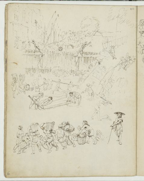 Editor: This is Théodore Géricault's "Sheet of Sketches: Cavalry Battles and Mounted Soldiers" from 1813-1814. It's a graphite drawing on paper. It feels... chaotic, like a snapshot of swirling movement frozen in time. What catches your eye in this frenetic scene? Curator: Frenetic is the perfect word. It feels like a window into Géricault's mind, a raw outpouring of energy. For me, it's the dance between order and disorder. You have these compartmentalized vignettes, almost like comic book panels, but within each, there's this wild, untamed dynamism. See how the horses rear, how the soldiers are almost tossed about? He's capturing not just a battle, but the feeling of battle, the adrenaline and chaos. Don’t you think the medium, the simple graphite on paper, emphasizes this immediacy? Editor: I see what you mean about immediacy. It feels like he's trying to capture a feeling more than a precise historical depiction. Do you think there's something to be said about the repetition of the subject matter, all these horses and soldiers? Curator: Absolutely. It’s almost obsessive, isn't it? He’s clearly grappling with something. The repetition allows him to explore different poses, different emotional intensities. Géricault was fascinated by the power and the fury of war, but also, I think, deeply troubled by it. This sheet feels like a working-through of that conflict. Think of the Raft of the Medusa, he had to go somewhere to find inspiration. I feel like in that sense that these images reflect his deep thinking. I would like to explore his artistic perspective by traveling there and seeing it first-hand. I have to admit that some sources tell me the experience was an intensely challenging one for him and it gave him lots of trouble. It really leaves you in a state! Editor: Wow, I never considered the raw emotional quality so much. Seeing this now made me think differently of Géricault, almost personally! Curator: Exactly! These sketches, they're more than just studies, they're glimpses into his soul.