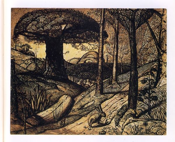 Editor: Here we have Nicholas Roerich's "Forest," painted in 1921 using tempera and oil paint. It strikes me as quite eerie. What do you see in this piece? Curator: Beyond the surface representation of a forest, I see a potent exploration of the relationship between humanity and nature, particularly relevant during Roerich's time, which saw immense social upheaval and environmental exploitation. Those figures lurking among the trees, are they guardians, or are they victims? How does Roerich use the visual language of symbolism to speak about the anxieties of a world undergoing rapid change? Editor: So you're saying it's not just a landscape, but also a commentary on the state of society? Curator: Exactly. The formal structure is quite interesting as well. The high horizon line, for instance, traps the viewer within the woods. And the simplified forms… do you think they echo traditional folk art, and therefore the resilience of Russian culture? Perhaps a gentle rebellion against the suppression that defined Russia and Eastern Europe during the early twentieth century. Editor: I never thought of it that way, but the figures *do* have a strange, almost defiant quality to them. Curator: Considering the artist's background and the political climate, the painting could be interpreted as a meditation on cultural identity and the need to safeguard it from oppressive forces. Don't you think the forest represents both a place of refuge and a site of potential danger? It seems to call to ancient pagan belief systems that empower women. How might the artist position that idea to the social-political dynamics of the time? Editor: I suppose that makes the title 'Forest' quite loaded. It's a call to protect not just the natural world but also cultural heritage. Thanks for helping me consider what I have overlooked here! Curator: And thank you, it is interesting how artworks allow to see our own reflections on canvas.