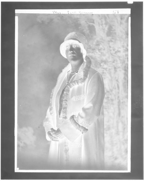 Curator: This intriguing piece, an “Untitled portrait of a seated woman in cloche hat and fur stole,” comes to us from the Hamblin Studio. It's currently residing at the Harvard Art Museums. Editor: It has the feel of a dream, doesn't it? Ethereal, but with a subtle weight of melancholy. The high contrast gives it a ghostly quality. Curator: Indeed. The fur stole and cloche hat signal a specific era, likely the 1920s. The woman's attire speaks volumes about her status, a signifier of wealth and belonging within a certain social strata. Editor: I can't help but think about the performance of femininity during that period. The constraints and expectations, even within this seemingly glamorous image. It's a complex dance between empowerment and confinement. Curator: A dance perfectly captured by the Hamblin Studio. The gaze, although somewhat obscured by the photographic style, feels both direct and distant. A potent combination. Editor: It leaves me with a feeling that there's a story here that has yet to be revealed, a life lived beyond the frame. Curator: Precisely. That's why it's so captivating. It resonates.