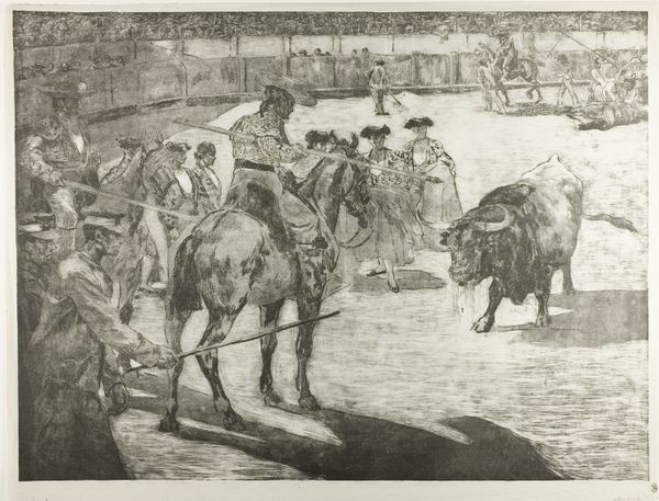 Curator: Goya's engraving from circa 1815, "En spansk rytter knækker korte spyd med hjælp fra sine sekundanter," which translates to "A Spanish Rider Breaking Short Spears with the Help of His Assistants," presents quite a dynamic scene. What's your immediate take? Editor: Visually, there's an arresting imbalance here. The etching seems to strain, doesn’t it, to contain such raw animalistic fury? The monochromatic palette amplifies the intensity, it's quite powerful. Curator: Indeed, the composition funnels our gaze towards the frenzied bull, but the riders also exhibit a fascinating structural role in the drama. See how their poses, almost mirrored, bracket the conflict. Editor: For me, that animal fury is intrinsically linked to labor here; Goya exposes the harsh, visceral engagement in an industrial performance—the exploitation inherent in the sport, not just the spectacle. It’s less a refined art and more a rough trade when one really examines the image. Curator: Precisely, this piece transcends simple spectacle, tapping into darker social commentaries on power and violence, mirroring Goya’s broader series, "La Tauromaquia". We could look at the work through semiotic concepts like contest and struggle in an early modern venue. Editor: Thinking about the engraving process and printmaking here, each line incised would necessitate significant labor, shaping not only the final image, but equally affecting the distribution and audience it would meet as a distributed reproduction in mass quantities, a key consideration for its era. Curator: Well said. Notice also how Goya utilizes light and shadow to heighten the drama, a contrast inherent within romanticism: The arena almost feels like a stage set, illuminating and yet confining the struggle unfolding before us. Editor: True. So the materiality is crucial, here—the reproductive method impacts viewership and accessibility. In that light, we’re seeing a narrative around labor relations across material conditions. That is what makes it unforgettable. Curator: It has been a stimulating exchange as always; I must add that looking closer, its formal aspects, especially the orchestration of light and subject in Goya’s hands, are nothing short of masterful. Editor: Agreed, it's been enriching. The image pulls you in as soon as one grasps how social realities impacted materials in Romanticist culture and vice versa.