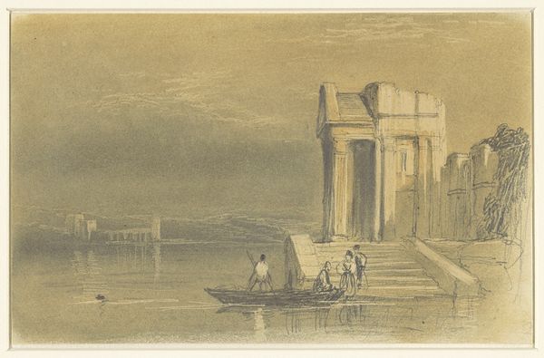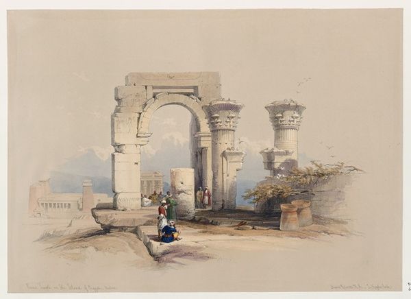 David Roberts created this watercolor titled 'The Temple at Dendur, Nubia'. Roberts used paper and watercolor in a way that reflects the romantic vision of the era. The technique allows for the creation of atmospheric effects and a soft, diffused light, imbuing the ancient architecture with a sense of timelessness and mystery. Consider how Roberts was engaging with a wider cultural fascination with antiquity. He wasn't merely documenting a scene, but also participating in the era's orientalism, an interest that fueled archeological expeditions and the acquisition of ancient artifacts by European museums. The labor and resources required for such expeditions, and the movement of artifacts, speak to broader issues of colonialism and cultural appropriation. This work, through its materials and composition, invites us to reflect on the relationship between art, history, and power.