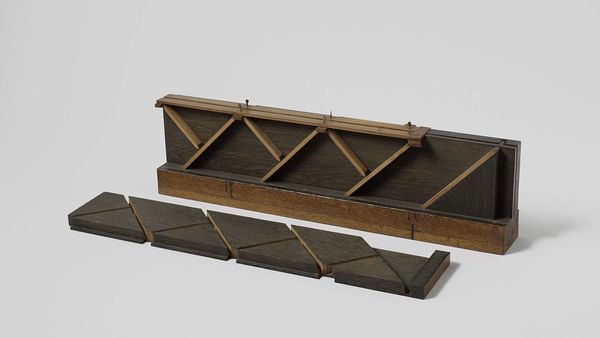 Curator: Ah, the "Model of a Dry Dock," crafted back in 1866. Editor: It's oddly calming, in a way. A stoic little stage set for something momentous. The precise geometry contrasts sharply with the implied drama of ships rising and falling. Curator: Drama, absolutely. Dry docks are about revealing the underbelly, the secret hurts of enormous vessels. Think of what a potent symbol the ship itself has been – journeys, wars, trade… And then to see it vulnerable, exposed! Editor: Makes you consider hidden histories. All those barnacles scraped away, the layers of paint built up over decades – whispers of distant ports clinging to the hull. Curator: The artist behind it, Rijkswerf Willemsoord, really understood that theater of repair, I think. Using, wood and other unspecified materials—it emphasizes the humanity, even in something so industrial. Editor: Exactly. Wood, which represents nature but it is fashioned, shaped to control nature, in some respect. Almost like containing a maritime beast, with the solid construction. Does it hint at mankind's ambition, our impulse to master every environment? Curator: I like that—the ambition encapsulated. Perhaps the model itself is symbolic: a contained idea of control. And it fits in that era so well—the age of empires believing they could master all the oceans. Editor: You know, even a structure intended for mere utility accrues such weighty symbolism through use and time. Each stain, each imperfection probably embodies thousands of stories. Curator: Indeed. This little sculpture is truly more of a prompt for contemplation about much larger dramas. Editor: Now I see it too!