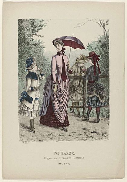 Editor: This lithograph, "De Bazar, 1887, Nr. 2, Pl. 670," from 1887 depicts a scene of fashionable women in what appears to be a bazaar setting. There's a sense of bustle, but also an emphasis on displaying elaborate garments. What's your interpretation of this print? Curator: What strikes me immediately is the institutional context. "De Bazar" likely circulated as part of a fashion magazine or similar publication. The image, though seemingly a genre scene, is really operating as an advertisement, promoting certain ideals of feminine beauty and consumerism. Notice how the figures are arranged; they are carefully positioned to showcase the latest dress designs, rather than engaged in any meaningful interaction. The social function of the print trumps any narrative depth. Editor: That's a great point about the advertisement aspect. It really shifts my perspective. Do you think the artist had much creative freedom given that purpose? Curator: Creative freedom within constraints, I’d say. The artist was likely commissioned, so the magazine publisher dictated the subject matter. However, the Impressionistic style is worth noting, softening the edges and creating a sense of ephemeral beauty which elevates the consumer goods being depicted and helps to blur the lines between art and commerce. How does knowing it's a print change how you view its value or place in art history? Editor: I definitely undervalued it before. Considering how widely these prints circulated, I can see how impactful it would have been in shaping popular taste and consumer culture. Thanks! Curator: Precisely! Thinking about prints like this helps us understand how visual culture operated then, how it created desires and reinforced social norms. Always consider who made it, for whom, and why!