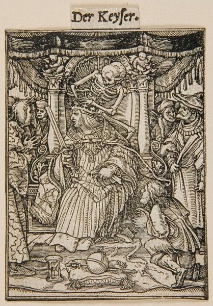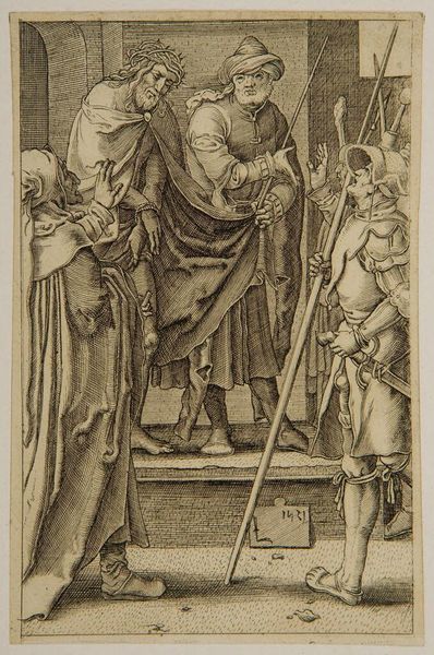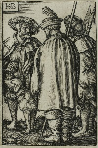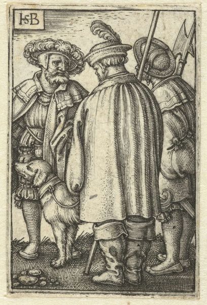 Editor: Here we have Sebald Beham’s tiny engraving, "Three Soldiers and a Dog," created sometime in the first half of the 16th century. It’s fascinating how much detail he packs into such a small space. How might this imagery reflect the socio-political issues of the time? Curator: Notice how Beham, working during the Reformation, portrays these armed figures. How do you interpret their dress and weaponry in relation to the rising militarization and social unrest of the era? Consider the dog, too. Does it symbolize loyalty, or perhaps the predatory nature of conflict? Editor: I hadn't considered the dog as symbolic of the conflict itself! It's interesting to think about the artist embedding social commentary in such a small, seemingly simple scene. Curator: Exactly. Beham's work prompts us to reflect on the era's anxieties around power, loyalty, and the human cost of conflict. Editor: I’ll never look at a tiny engraving the same way again. Curator: And hopefully you will see the importance of art within its historical milieu.