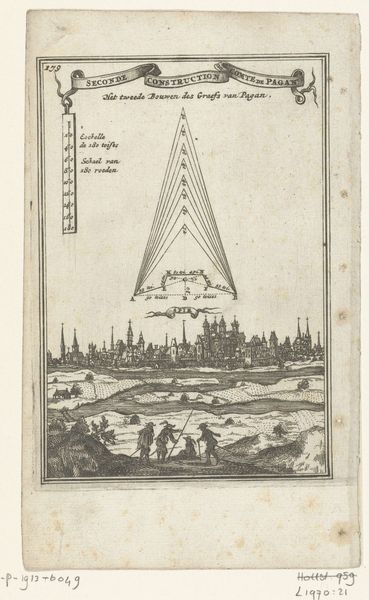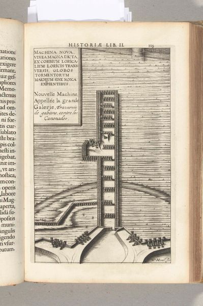 Curator: Here we have a print titled, "Siege of Ostend: the storm bridge of Targone, 1604". This engraving is currently held at the Rijksmuseum, and the piece is by an anonymous artist from around 1604. Editor: My first thought? This looks like an illustration straight out of someone's medieval war-game manual—equal parts frightening and hilariously impractical. It gives you a true sense of both technological invention and almost comical execution. Curator: Well, in terms of technology, it's definitely meant to capture that spirit of Renaissance ingenuity during wartime! We see that quite literally with a diagrammatic aesthetic. Editor: Right, you almost can’t miss how much labor it takes. Look at how many draft animals are roped up to make this invention work. Not only that, the final structure feels almost secondary to this print; like, how the knowledge gets passed around among builders takes precedence over some final object of display. Curator: Absolutely, you're zoning in on that production aspect which this piece displays proudly. Consider also how prints at the time played an educational and somewhat propagandistic role. It was like, "Here's the cool, scary thing we have!"—a technological flex, essentially. Editor: So a flex made with lines and pressure from an etching press. Tell me, who was consuming something like this, back then? Curator: Certainly the upper classes, military personnel, people in positions of power interested in such developments... Remember this comes during the Dutch Revolt— a pivotal time for technological innovation on the battlefield. The Northern Renaissance focus on detail lends itself particularly well here. Editor: And given its function, wouldn’t it make sense that "accuracy" became a style? I’d reckon they’re paying pretty close attention to things like the tensile strength of rope, the weight distribution of such a massive moving structure... Curator: Indeed, and despite its age and practical origin, its continued ability to intrigue lies perhaps in its raw, unfettered visualisation of invention as a product itself—the genesis and execution together captured and then shared, reproduced, almost endlessly across Europe at that time... I’m seeing in it the past's image of the future. Editor: I suppose, that’s fair. For me, though, its appeal lives most vividly in just how much sweat and timber would have needed to be invested, and the sense of anxiety that surely came with it—both the promise and real danger in such grand gestures of progress and ruin.