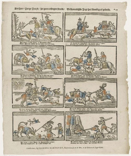 This print, titled "The War Deeds, of the Allied, and French Armies," was made by Johannes Kannewet, a publisher in Delft, but the date of its creation remains unknown. Kannewet's print offers a glimpse into the visual culture of the time. The crude style, reminiscent of popular broadsides, suggests an appeal to a wide audience during a period of conflict. The scenes depicted, seemingly celebrating military victories, invite us to consider the politics of imagery in times of war. What narratives are being promoted here, and for what purpose? Understanding the social conditions that shaped this print requires further investigation. Researching the specific conflicts of the time and Kannewet's role as a publisher could reveal the broader context in which this image was created and consumed.