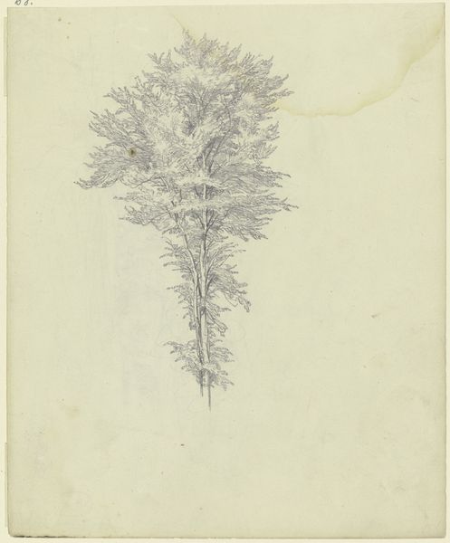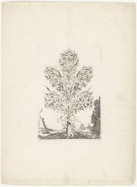 Curator: I find this engraving, "Ridderspoor" created around 1821 by Auguste Piquet de Brienne, strikingly delicate. Editor: Yes, it has a fragile, almost ghostly quality. The stark contrast and the fine lines evoke a sense of ephemeral beauty, like a pressed flower in an old book. Curator: I think that sense of fragility aligns with the broader Romantic movement, doesn't it? The way nature, so fleeting and vulnerable, is elevated as a subject of intense focus. Editor: Precisely. Consider the emphasis on line, creating intricate detail. It's as if the artist is trying to capture every minute variation in the flower's form, freezing a transient moment. The stippling and cross-hatching used to create shadow and texture also feel so meticulously executed. Curator: And in that time, the natural sciences were undergoing immense growth. Botanical illustration became crucial for scientific study, but the form could be highly subjective too, with artistic license still holding a valuable place in rendering form. Editor: True, the scientific aspect is definitely there; it's a precise depiction of the plant. However, there's an undeniable romanticism, maybe even an idealization of this particular bloom. It’s nature, seen through an emotional lens. It seems as though Brienne isn’t only showing us the *what* but also the *how* nature can move us. Curator: Do you feel the engraving suggests an engagement with the role of botanical science itself? Editor: I suspect it suggests, maybe, something just beyond. In terms of composition, the upward growth of the flower creates an undeniable visual flow. This underscores a sense of aspiring beauty and, more abstractly, life. Curator: So, it is then not simply about a moment frozen but also something about the dynamism within the frame? An interesting consideration. Editor: I agree, seeing it within its cultural moment does broaden the lens. Thank you for bringing this to light. Curator: And thank you; seeing its dynamism has altered my perspective of its presence greatly!