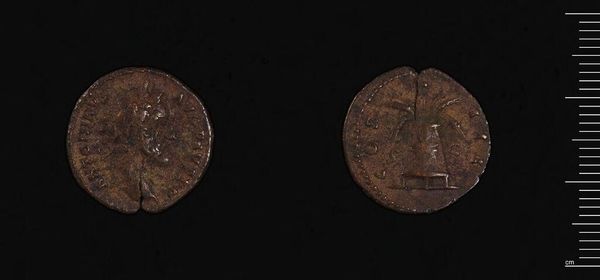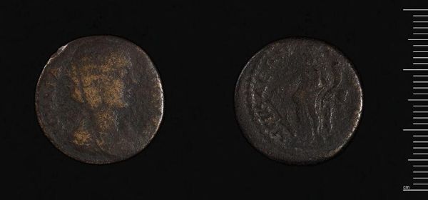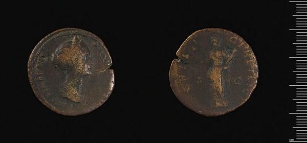 Curator: Here we have a sestertius, a Roman coin. This one features Faustina II, wife of Emperor Marcus Aurelius. Its heft is impressive, over 20 grams. Editor: It feels incredibly tactile, doesn't it? I can almost feel the countless hands that must have held it. There’s something deeply human about that. Curator: Absolutely. The wear and imperfections speak to its lived history as a functional object, circulating within a vast economic system. The material—the base metal—is significant too. Editor: It makes you think about value, both intrinsic and assigned. And consider the irony, immortalizing an empress on something so…mundane. It's both grand and intimate. Curator: I agree. It's a reminder that even the most powerful figures are ultimately part of the everyday fabric of human existence. Editor: I think I'll leave here pondering the weight of history—literally! Thanks for that, this coin held more than face value.