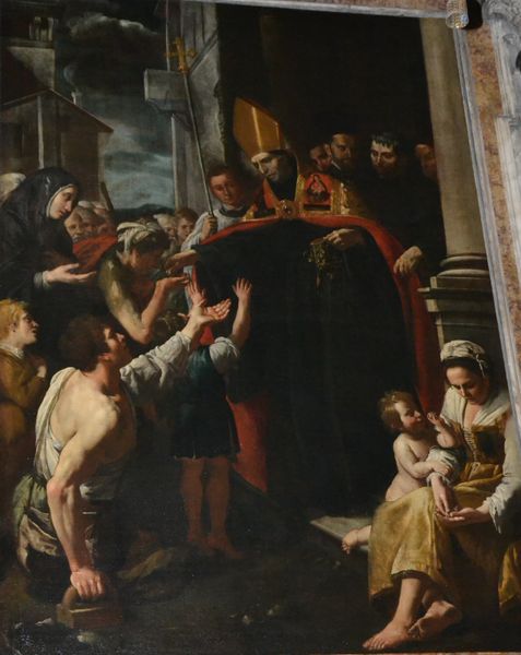 Curator: Ah, yes, "The Raising of Lazarus," likely painted by Rembrandt van Rijn sometime between 1630 and 1642. The dramatic subject matter certainly leaves an impression. Editor: That's putting it mildly. It feels like stepping into a dream—or maybe a nightmare. The darkness, the way the figures emerge from it...it's heavy, almost suffocating. Like witnessing something not meant for mortal eyes. Curator: Observe how Rembrandt orchestrates light and shadow. The chiaroscuro technique, a hallmark of Baroque painting, amplifies the emotional intensity. The stark contrast illuminates Lazarus as the focal point while cloaking the surrounding figures in varying degrees of obscurity. This invites an engagement that’s simultaneously revealing and concealing. Editor: Exactly. We see just enough. Lazarus himself seems caught between worlds, pale and unreal. And then there’s that figure completely shrouded in black—they give me the shivers. It's as if grief itself has taken human form. Do you think Rembrandt’s playing with ideas of sight, knowledge, and the limits of perception? Curator: Intriguing thought. In semiotic terms, we could analyze the use of light as a signifier. It's not merely illumination; it functions as a symbol for divine intervention, truth, or even, dare I suggest, the aesthetic revelation inherent in art itself. The darkness then could represent the unknown. Editor: Maybe, or maybe it's simpler than that. Grief, faith, and the raw, terrifying power of life and death made visible through pigment and brushstroke. Rembrandt just gets to the heart of the matter. The details almost feel beside the point, it could just be that stark composition that conveys its significance. Curator: That perspective definitely enriches how we think of its impact. Focusing too narrowly can definitely be limiting! Editor: It definitely goes to show, art is a deeply personal conversation after all. Thank you.