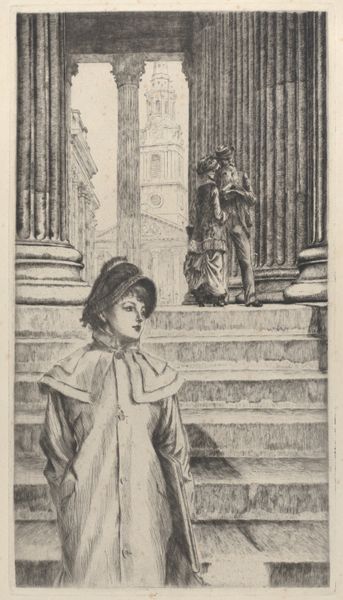 Curator: Immediately, a hushed theatricality strikes me. The stark black and white, the stage-like architecture... Editor: That's fitting. We're observing Aubrey Beardsley's "Frontispiece Design," a drawing from around 1895, now held at the Harvard Art Museums. The dimensions are roughly 30 by 18 centimeters. Curator: Those doves, the fountain—they suggest idealized love, perhaps even a courtly romance. But there's a certain… stillness. Almost frozen. Editor: The lack of shading, the sharp delineation of form, certainly contributes to that. Beardsley masterfully manipulates line to create a sense of depth and volume, doesn’t he? Curator: Indeed, the formal rigor almost overwhelms the potential sentiment. The rigid lines of the architecture versus the soft curves of the figure create a compelling tension. What do you think? Editor: Perhaps that's precisely the point. Beardsley frequently challenged conventions, and here he might be subverting expectations of romantic imagery with a highly stylized structure. Curator: An elegant dance between emotion and intellect. Editor: Precisely! A visual riddle rendered with impeccable precision.