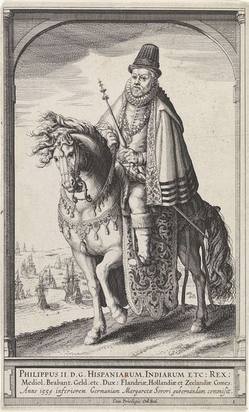 Curator: Oh, the ruffs of the era, just glorious! Before us we have a piece titled "Portret van Isabella Clara Eugenia, infante van Spanje," a print by Christoffel van Sichem I made before 1601. It’s currently housed here at the Rijksmuseum. Editor: The level of detail is stunning. Immediately I’m struck by the opulence, but with a somewhat severe dignity about her. Almost regal sorrow in those eyes. Curator: That sorrow, I think, stems from the cultural weight she bore. Isabella Clara Eugenia was, of course, a significant figure in her own right, the daughter of King Philip II of Spain, but look at how her dress communicates wealth, power, lineage, a veritable tapestry of dynastic importance. It echoes the weight of expectations, doesn't it? Editor: Absolutely. The formality is almost suffocating. You can sense the performative aspect of her image. It is definitely history-painting at its finest. Also, I find something charmingly awkward about the flat, almost schematic, rendering of the figure against the rudimentary perspective of the floor tiles. A naive grandeur, maybe? Curator: Indeed, this Northern Renaissance aesthetic balances ornate detail with a flattened perspective which is a common trait for the period, placing the emphasis on conveying information about Isabella, about her status, rather than mimicking photographic realism. Each pearl, each embroidery detail is meticulously rendered. It's about presenting a symbol of power. Notice, too, her austere gesture, barely holding her gloves. The print served a purpose: reinforcing the idea of royalty and reminding us, centuries later, of that construction. Editor: And she embodies that representation perfectly, doesn’t she? Caught between private feeling and her very public role. It’s really striking, now that I see the symbols you are talking about, that the print succeeds in making that burden legible. Curator: It’s why such portraits, while stylized, still resonate. They capture not just a likeness but a specific moment in the ongoing narrative of power, and how identity is not merely an individual choice but a combination of inherited roles. Editor: Well, thanks for clarifying my impressions with such insightful observations. It has given me a completely different perspective. Curator: A pleasure. Hopefully this sheds a little light on the story behind this fascinating person portrayed, as it connects history, psychology, and the symbols with which we construct identity.