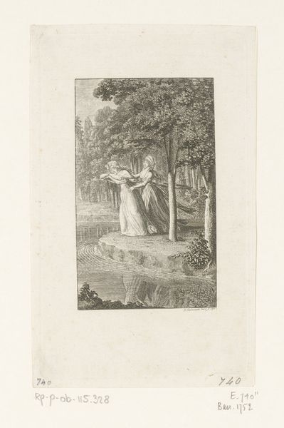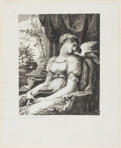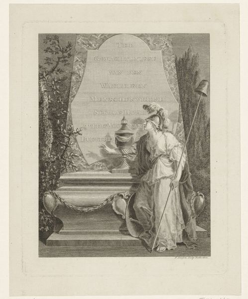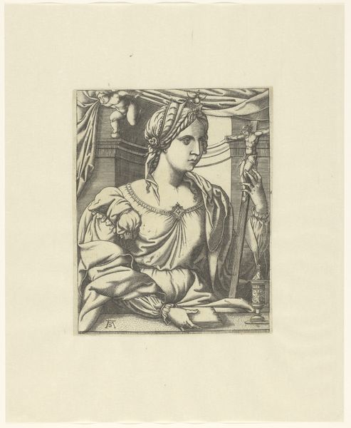 Curator: Welcome. Let's consider Johann Sadeler I's "Heilige Lucia" from the late 1580s, found in the Rijksmuseum collection. It's an engraving printed with ink on paper. Editor: This engraving really strikes me; there’s something incredibly serene yet deeply sorrowful in Lucia's expression. The stark monochrome enhances the drama, even amidst the tranquility. Curator: The process of engraving, meticulously transferring an image onto a metal plate, is crucial. Look closely. This intaglio technique speaks to a rising print culture during the Mannerist period and broader distribution of devotional imagery through printmaking, impacting art production. Editor: Absolutely. Lucia holds a palm frond – a clear symbol of martyrdom – while reading. A sword also lies close by. The eyes placed upon the book evoke her status as the patron saint of the blind, her story one of resilience. Curator: Indeed, those iconographic elements build the narrative. We're reminded of how saintly figures could disseminate ideals and even moral principles. Considering the physical labor involved, producing copies enabled wide audiences to "possess" holiness materially. Editor: It makes you consider the setting as well, it is more than just a landscape, that tree stands starkly as an emblem of fortitude or a dark reminder of impending execution. In the distance, are we seeing a depiction of her martyrdom unfolding, emphasizing that eternal hope exists even in death? Curator: Considering the role images like this had, in their original setting, they would be powerful affirmations, influencing everything from domestic worship to displays of affluence. The paper and ink's material longevity enabled it to outlive those original contexts, preserving faith across changing epochs. Editor: Looking closer at this "Heilige Lucia," her narrative, imbued in material and symbol, carries the heavy cultural weight of sacrifice for something greater than the worldy existence and, in some way, has not diminished its potent force with time. Curator: It really has a tangible impact, then. As the work survives, each print preserves cultural beliefs while witnessing ever-shifting approaches to labor and creation.