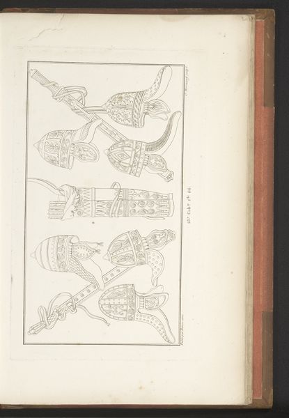 This is an engraving of a fashion plate from Elegantia, a magazine of fashion, luxury and taste for ladies, made in July 1808 by an anonymous artist. The composition is structured around a grid of delicate bonnet illustrations, each distinguished by subtle variations in line, color, and decorative detail. The artist’s restrained use of color, primarily pastels and muted tones, speaks to a formal elegance, while the intricate details of lace, ribbons, and embroidery highlight the materiality and craftsmanship of early 19th-century fashion. Semiologically, each bonnet functions as a signifier of social status, taste, and femininity. The arrangement of these elements within the frame creates a visual rhythm that reflects the period's emphasis on order and refinement. This framework, however, also hints at the nascent shifts in fashion and social norms, where personal expression starts to subtly challenge established conventions. These designs represent a moment of transition, capturing the interplay between tradition and emerging trends.