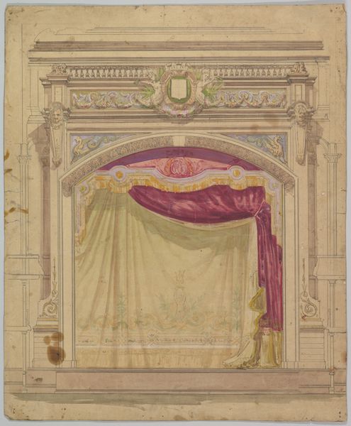 Editor: So, this is Eugène Cicéri's "Design for a Stage Set," likely from between 1830 and 1890, created with watercolor, gouache, and graphite. It feels so opulent, all those layers of fabric and detail! What story do you think it's trying to tell, or is it even about that? Curator: More than a specific story, it speaks volumes about the societal context of theatrical performance and spectatorship in the 19th century. Notice the prominent display of the curtain. In effect, what is being unveiled here, and for whom? Think about class, access, and representation. Who was welcome in these spaces, and whose stories were told on those stages? Editor: That’s an interesting perspective. I guess I was focused on the pure aesthetic of the piece, the color and ornate detailing. The way that the watercolor gives this translucent, shimmering effect is fascinating. Curator: The materiality, absolutely, plays a part in that construction. But don't let that shimmer distract from its cultural work. Consider, for example, the role of theatre in solidifying social norms or, conversely, the subversive potential of challenging them. Were there performances in spaces like this that might have pushed those boundaries, reflecting the burgeoning movements for social change happening at the time? What kinds of commentary did theatre provide? Editor: Hmm, I hadn’t thought of it that way. So, it’s less about the individual artist's intent, and more about the social dialogue it participates in? Curator: Exactly. It becomes a document, unintentionally perhaps, of the values, anxieties, and aspirations circulating in society. Seeing this artwork as situated within intersectional narratives focusing on class and power helps us deconstruct and analyze these settings in detail. Editor: This makes me see beyond just the pretty colours. The set becomes a character itself. Curator: Precisely! And that character whispers volumes about the era that birthed it. Editor: I will always look at theatrical designs from now on through a more critical and analytical lens. Thank you.
