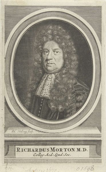 Curator: Looking at this engraving, what immediately strikes me is the intensity of expression in Jean Racine's eyes, quite commanding for a work rendered entirely through the precise art of engraving. Editor: It has a somewhat melancholic feel to me. Considering this portrait of Jean Racine dates roughly from 1740 to 1760, tell me more about how engravings circulated and shaped ideas about prominent figures during this era. Curator: During that time, engravings like this weren't just decorative; they served a vital function. They helped disseminate images of influential individuals, propagating their likenesses and, by extension, solidifying their cultural presence. In the context of the French Enlightenment, visibility was a form of power. Editor: I notice the ornate oval frame surrounding the portrait and the rather elaborate wig. How might these details contribute to the message conveyed by the image? Curator: Both serve as powerful visual signifiers. The oval frame, a common Baroque motif, lends an air of classical refinement, immediately connecting Racine with intellectual and artistic tradition. As for the wig, well, it was the height of fashion and status, indicating Racine's position within the French court and the literary world. But notice also the pelican coat of arms: for centuries it was the symbol of sacrifice and selflessness. Editor: An interesting contrast! So we have both vanity and virtue intertwined in his presentation. And what of the text beneath the image—what does it signify? Curator: The inscription below is key. It's a quotation about Racine's skill—"Voler aussi haut que Corneille," indicating the intent of Racine’s project in reviving old forms in verse. But, crucially, it functions as promotional copy and tribute, securing his literary legacy by linking him to the French literary canon. Editor: Thinking about the historical context, I wonder, were these portraits widely accessible, or were they primarily consumed by a specific class or intellectual circle? Curator: While engravings were more accessible than painted portraits, distribution still depended on wealth and social standing. Educated elites and members of the bourgeoisie, keen to engage with intellectual trends and display their knowledge, were most likely to collect and circulate such images, particularly as they related to literary and theatrical figures. Editor: Seeing how carefully the portrait blends personal presentation with larger artistic and social currents certainly enhances its lasting significance. Thanks for sharing your insights. Curator: Indeed. Considering this engraving through its layered symbols, we realize it goes beyond mere likeness, revealing cultural memory, constructed fame, and the fascinating social fabric of the French Enlightenment.