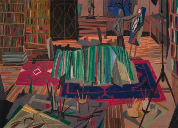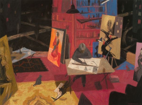 Iwo Zaniewski created this artwork, "Me and Kaj 3", using a blend of surrealism and psychological insight. Observe the distinct duality of light and shadow, almost a modern take on chiaroscuro. These motifs, seen as early as the Renaissance, serve here to enhance the painting's emotional depth, dividing the space between the active, illuminated artist and the contemplative, shadowed figure. The circle on the carpet and the open window leading to the verdant outside suggest containment and liberation—a visual representation of the artist's internal tensions between creative focus and the desire for freedom, themes that we might see echoed in Munch's "The Scream", where nature reflects inner emotional turmoil. The figure in shadow, seemingly lost in thought, evokes a sense of introspection, a kind of dialogue between the artist and his muse, the self and the subconscious. This duality represents a powerful force engaging viewers on a deep, subconscious level, reflecting the cyclical nature of human experience where symbols of confinement and freedom, shadow and light, constantly resurface.