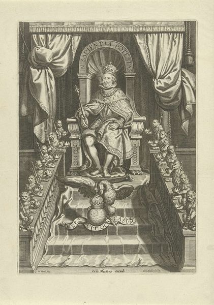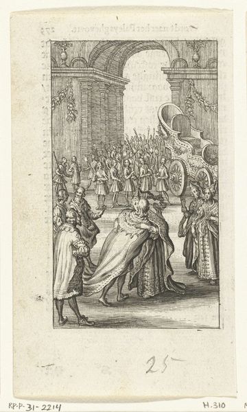 This engraving, made by an anonymous artist, captures the biblical story of the Queen of Sheba's visit to King Solomon. Notice how the composition is structured around a clear diagonal, from the lower-left corner where the Queen kneels, up to the regal figure of Solomon on his throne. The artist uses linear perspective to create depth, drawing our eye into the architectural background, but the flatness of the figures and intricate detail work against a realistic illusion of space. Solomon's posture and the arrangement of figures around him create a sense of hierarchical order. The inclusion of lions, symbols of power and royalty, flank Solomon. The artist seems less interested in naturalistic representation and more in conveying symbolic meaning through carefully arranged forms. This structured approach encourages us to reflect on the themes of power, knowledge, and divine favor that the narrative embodies.