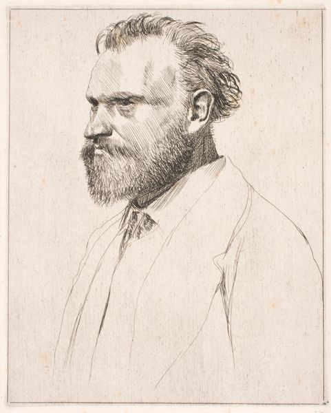 Editor: Here we have Herman Webster's etching "John Runciman." It's a simple portrait, but there's a kind of serious intensity to the sitter’s gaze. What stories do you think it's trying to tell? Curator: This portrait speaks volumes about the social construction of masculinity within fin-de-siècle artistic circles. Consider the beard, the furrowed brow—do these not signal intellectual gravitas, aligning Runciman with established ideals of male authority and artistic genius? Whose stories are being centered here, and whose are being marginalized? Editor: So, it's more than just a portrait; it’s a statement about societal expectations? Curator: Precisely. Webster isn't simply depicting an individual; he's reinforcing a particular power dynamic. Think about the gaze: who is allowed to look, and who is being looked at? Editor: That gives me a lot to think about. Thanks!
