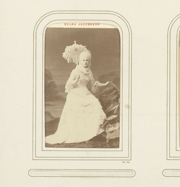 Editor: So, this is "Portrait of Anna Maria Strandberg by a Balustrade" from the late 19th century, made using albumen print. It’s got a theatrical feel; she’s posed like an actress. What stands out to you when you look at this portrait? Curator: For me, it’s all about the process. Look closely at that albumen print. Each step - the coating, sensitizing, exposing, and developing - relied heavily on specific materials and darkroom practices. And consider Selma Jacobsson, the photographer, as a woman working within the heavily male-dominated photography studios. How much autonomy did she have over the subjects, materials, and the finished product? Editor: That's an interesting angle! I hadn’t thought about the level of control she had over it. So, it is more than just pressing a button. Curator: Absolutely. We must also remember how labour-intensive this type of photography was back then. The subject sitting still for long exposure times. And the processing itself, imagine the physical effort in a darkroom, mixing chemicals, manipulating the paper. What kind of wages would they be making? Are we seeing a staged performance of affluence and leisure that actually rested on exploited labour? Editor: I see what you mean! The photograph as a record of material conditions, not just artistic intention. What do you make of the objects and clothes depicted here? Curator: Let's examine that dress. The fabric, the style – those elements were determined by textile production, trade routes, fashion trends. They tell a story of material culture and economic forces. This type of object may now seem commonplace in a museum like the Rijks, but during that period that particular garment might have been available only to the elite class. How were similar things accessible to common people? Or, how were people using objects made with other cheaper resources? Editor: Thinking about the materiality definitely makes me rethink the photograph. Thanks for a completely new insight into the artistic work! Curator: Agreed. Looking at the tangible process really highlights what photographs are designed to conceal.