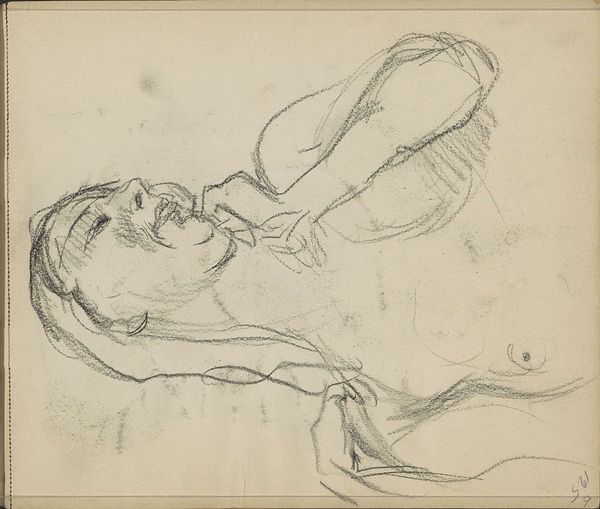 Curator: Right, let's look at Jozef Israëls' pencil drawing, "Woman in an Evening Dress with Bare Shoulders," sometime between 1885 and 1902. The work now resides here at the Rijksmuseum. What strikes you? Editor: Instantly, I feel a lightness, almost a dreamlike quality. The tentative, impressionistic lines suggest a fleeting moment. I wonder what she's reaching for...or maybe she’s dancing. Curator: I think you've picked up on the essence of this piece so well. Israëls was interested in capturing the fleeting beauty and emotion of everyday life, a hallmark of impressionism. That ethereal quality comes from the use of pencil and the sketch-like, unfinished style. Editor: It’s like she’s grasping at the moon, or maybe just an idea of the moon. Circles have always represented wholeness, unity, infinity, and the cyclical nature of existence. Perhaps Israëls is exploring some of these concepts through this work. The bare shoulder can symbolize exposure, vulnerability, an offering, even if she’s fictional. Curator: It's fascinating how the imagery works here, layering intimacy and spectacle, don’t you think? The dress indicates a certain social setting, while her posture evokes a sense of unguardedness. I suspect Israëls meant to convey this feeling of personal expression. Editor: Indeed. While clearly posed and "staged" she reveals something timeless – aspiration, reaching, hoping. We see something raw that lingers between social expectation, or social construct, and personal vision. It invites endless speculation, so rich with layers and possibilities that it's easy to fall down the rabbit hole in it, getting blissfully lost for an entire afternoon. Curator: And I agree! It's a beautiful piece, almost defiant in its vulnerability and incompleteness. It encapsulates an era grappling with modernity and changing notions of the feminine spirit, if I may sound a little old-fashioned. It's both intimate and expansive, both immediate and deeply symbolic. Editor: You know, thinking about it now, this delicate rendering manages to hold and reflect everything: culture and personal intention, representation and hope. So the invitation to get lost in this drawing really resonates now more than ever.