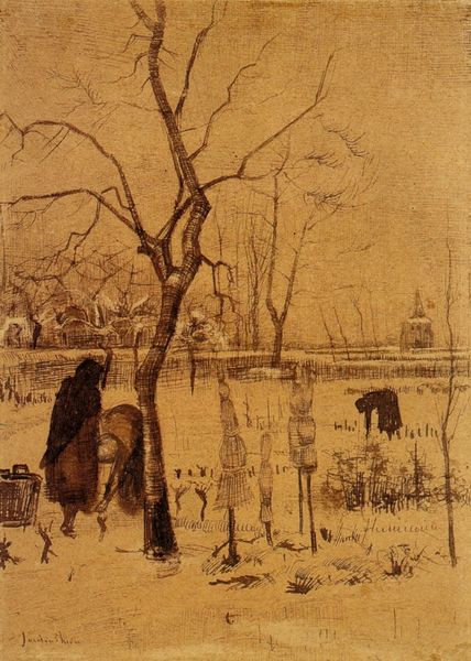 Here's a watercolor on paper made by Vincent van Gogh depicting Miners in the Snow. The very choice of watercolor and paper is interesting. This wasn’t a medium prized for posterity, like oil on canvas. It was immediate and portable. Look at how Van Gogh builds up the scene, with thin washes layered to create depth and atmosphere. The roughness of the paper is also key here. It absorbs and reflects the light, giving the snow a palpable texture. But let’s think about what this medium meant in Van Gogh’s time. Watercolor was often used for preparatory sketches, or as a hobby pursuit for the middle classes. By embracing it, Van Gogh deliberately associated himself with the everyday. Consider that subject matter, the miners themselves. They embody the harsh realities of labor and survival. In every way, this is an art of empathy, a demonstration of solidarity with the working class. It challenges the traditional boundaries of what art should be, both in its material and its message.