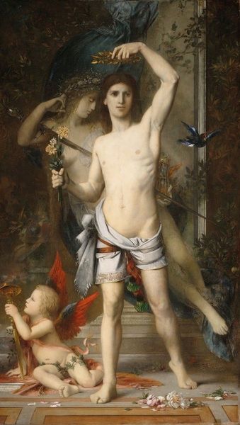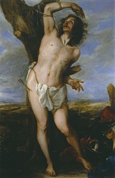 Curator: Here we have "Saint Sebastian" by Palma il Giovane, an oil on canvas painting that exemplifies the Venetian Mannerist style. While undated, it reflects the artist’s mature period, delving into themes of religious allegory and the male nude. What’s your initial reaction? Editor: It hits you right away, doesn’t it? Stark, but weirdly serene. I mean, he's tied to a tree, impaled by an arrow, yet there's this almost... dreamy quality to it? A really intense vibe. Curator: Exactly! The piece resonates with tensions inherent in representations of martyrdom. We have a saint, a symbol of resistance, but also a naked, vulnerable male form, which raises fascinating questions about power, beauty, and the spectacle of suffering in art. Editor: The light’s really doing a lot here, isn't it? All those pale, fleshy tones against the darker landscape, almost makes him glow. Sort of takes the edge off the...y’know...the whole arrow-in-the-chest thing. Curator: Light is pivotal. It directs our gaze, accentuates the idealized musculature, and softens the violence, certainly. Venetian painting, deeply rooted in the Renaissance fascination with classical aesthetics, used such visual tools to elevate religious narratives. It invited viewers to contemplate faith and physical beauty in tandem, setting the stage for deeper reflection. Editor: It’s like he's not in agony. I wonder, do you think the artist maybe downplayed the pain for a reason? He kind of looks posed. Almost… heroic? Curator: The heroic depiction underscores the narrative, reflecting the complex politics between faith, the human body, and social norms in the artist’s context. How does it connect to today's understanding of social justice issues? That’s a conversation that keeps the artwork fresh and relevant. Editor: Wow. So much to unpack in just one serene yet incredibly tense image. My dreamy thoughts definitely shifted. Thanks for nudging me in the right direction. Curator: Indeed, viewing art isn't just seeing but critically contextualizing and questioning—offering new avenues to learn and address the many pressing struggles that frame today’s complex intersectional social narratives.