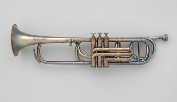Editor: Here we have Leopold Uhlmann's "Valve Trumpet in C", made sometime between 1870 and 1890. What strikes me immediately is the sheer physicality of the brass and the way the valves interrupt what would otherwise be very smooth lines. It's a beautiful, functional object. What do you see in this piece? Curator: The materiality speaks volumes. The trumpet’s construction reveals a story of labor, from the mining and smelting of the brass to the meticulous handcrafting of each component. The photographic representation flattens it, but one can almost feel the weight and temperature of the metal, and how mass production impacts the individual artistic flourish of crafting a trumpet versus its standardized creation today. What musical trends did this instrument serve and where was it crafted? What's the context for its consumption? Editor: So, you're saying to understand it, we need to understand who was buying and using it, and how it was made? I hadn't thought of it that way. I was thinking more about the sound, you know, the music it makes. Curator: Sound is a consequence. I think it’s useful to understand the processes of construction and labor that are tied to a piece of technology like this. A handmade brass instrument tells a story distinct from one created through automation. The musical intention merges with, or is overridden by, the material capabilities of its making, impacting how that intention comes to the musician and how they might execute it. Editor: I see what you mean. So by looking closely at the materials and the construction, we can understand its value within the musical landscape of its time. That’s a very different way of thinking about it than I am used to. Curator: Precisely. Understanding the context of production deepens our understanding of the artifact itself. Editor: I learned a lot today! Thank you. Curator: My pleasure, it has given me a new appreciation to listen to how I listen to music and understand its sources.