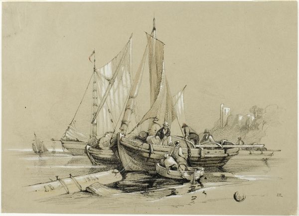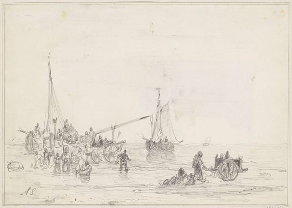 This is ‘Ships on the Beach’ by Petrus Paulus Schiedges, a Dutch artist working in the 19th century, rendered in pen and brown ink. Schiedges, born in Rotterdam, lived in a time of significant maritime activity and trade for the Netherlands. In this quiet and somewhat haunting scene, we see vessels beached on the sand, their grandeur diminished, their purpose temporarily suspended. The monochromatic palette lends a sense of timelessness, yet there’s a palpable tension between the human figures and the massive, idle ships. One can imagine the labor, the economic livelihoods, and the stories tied to these ships. These ships represent a time when the sea was both a source of immense opportunity and a site of immense risk. The image asks us to reflect on the relationship between humanity and nature, and on the ever-present reminder of time's passage. The beached ships can be viewed as metaphors for the end of a journey, a pause in activity, or even a commentary on the transient nature of human endeavors.