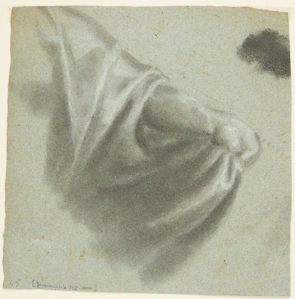 Editor: This drawing, "Draperiestudie," is attributed to Simon Andreas Krausz, made sometime between 1770 and 1825. It looks like a pencil and charcoal study on toned paper. The way the fabric bunches up at the bottom is fascinating – what’s your take on it? Curator: Well, aren't we drawn into the folds, almost literally? This isn't just fabric; it’s a study of form, an exploration of light and shadow, really. It makes me wonder, what grand design was taking shape in Krausz’s mind as he rendered this humble drape? Did he envision classical gods draped in such elegance, or perhaps a stage curtain rising on a dramatic scene? Editor: That’s interesting, I hadn't considered the stage. Is it typical for artists from this time to isolate studies like this? Curator: Absolutely. Think of it as a musician practicing scales, but with graphite. It's likely a preparatory sketch, a way for Krausz to master the way light falls, how fabric cascades and gathers. These studies allowed artists to hone their craft. What emotional response do you get from this image, if any? Editor: It feels almost...meditative. The repetition of the folds is kind of soothing. It wasn’t what I expected from romanticism though! Curator: Ah, but there is emotion isn't it, but very carefully restrained. Maybe think about the act of observing, and the quietude involved in creating something with such a level of control. Editor: That’s a cool thought; it definitely changes how I see the work! Curator: See? Even the most seemingly simple image can offer boundless interpretations, and reflections about its process, and our ways of observing, thinking and feeling. Editor: Agreed! It definitely pays to really slow down and look.
