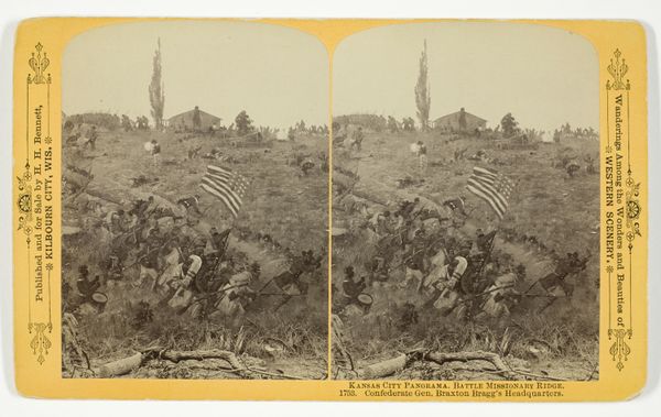 Editor: This is "Capture of the Gun, Lady Breckinridge," a gelatin-silver print photograph by Henry Hamilton Bennett, taken in 1889. It depicts a battle scene and strikes me as both chaotic and meticulously composed, given the limits of photography at the time. What details stand out to you in terms of materials or processes? Curator: The gelatin-silver print is itself a fascinating artifact. Consider the socio-economic implications of photographic reproducibility in the late 19th century. How did the increased availability of images shape the public's perception of events like the Civil War? And look at the material quality; the paper, the developing chemicals - how do these contribute to the image’s presence, its ‘aura,’ if you will? Do you notice how the framing structures our experience of the depicted warfare? Editor: It’s interesting to think about the gelatin-silver print as a democratizing force, bringing war imagery to a wider audience, and, as a commodity. And the framing makes it like a stage. But, what do you make of the seemingly detached viewpoint? The viewer feels very removed from the carnage, despite its apparent proximity. Curator: Precisely. This ‘detachment’ can be viewed as a product of its time – an almost ethnographic gaze imposed upon a landscape scarred by industrial-scale conflict. The chemicals used to produce this image, and its widespread distribution, mirrors in some way the machinery and material impact of war itself, wouldn't you agree? It commodifies suffering and perhaps distances its viewers from ethical implications of historical record making. Editor: Yes, absolutely. Looking at it through that lens makes me rethink the intentions behind such a work. I came in with a straightforward aesthetic reading, but now, I realize how the processes of production and consumption are inextricably linked to its meaning and our understanding of history. Curator: Exactly, it’s crucial to question the supposedly transparent nature of photographs as historical records. Considering its production can illuminate complex networks of labor, technology, and ideology.